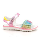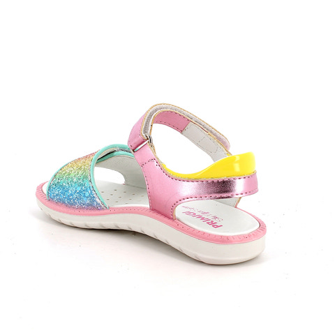 Pigesandal med åben tå og velcrolukning. Overdel i flerfarvet syntetisk materiale med glitrende frontrem. Indersål i formet og polstret læder. Let sål med fleksibel profil.