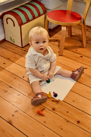 Angulus Begynder Sandal med velcro i farven Cognac/Cognac er den perfekte første sandal til små fødder, der skal ud på eventyr. Sandalen er designet med fokus på komfort og støtte, så barnet får den bedste start på gåturen. Den bløde og fleksible gummisål giver god bevægelighed og stabilitet, mens det naturlige læder sikrer et sundt fodklima. Sandalen har to praktiske velcrolukninger, som gør det nemt at tilpasse pasformen og tage sandalen af og på - også for de mindste. Den lukkede tå beskytter små tæer, og den åbne hæl og sider giver god ventilation på varme dage. Angulus er kendt for deres høje kvalitet og klassiske design, og denne sandal er ingen undtagelse. Perfekt til både daglig leg og pæne anledninger, hvor komfort og stil går hånd i hånd.
