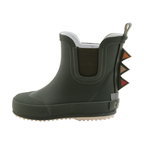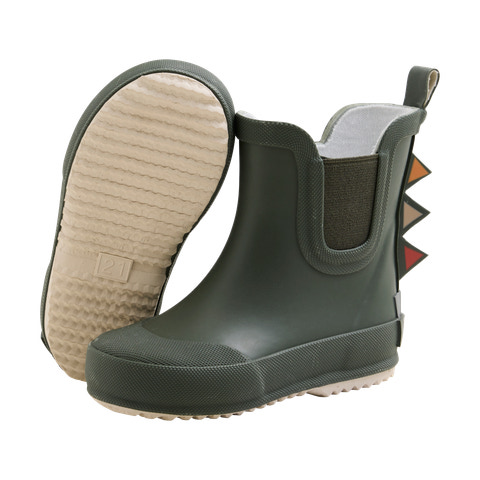 Lave og ensfarvede gummistøvler med dinosaur detaljer på hælen fra CeLaVi. Gummistøvlerne er lavet i naturgummi og har en refleksstribe bagpå. Der anbefales et voksetillæg på 1 1/2 cm.