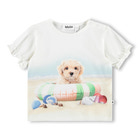 Eline T-shirt fra Molo er perfekt til børn, der elsker hunde og strand! Den bløde t-shirt er lavet af 95% bomuld og 5% elastan, hvilket gør den behagelig og fleksibel. Med det søde strandmotiv og hund, bliver den hurtigt en favorit.