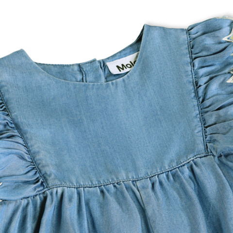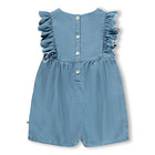 Fernanda Buksedragt fra Molo er lavet i blød viskose og har en flot, vasket blå farve. Den er perfekt til leg og hverdag, og de fine flæser på skuldrene giver et sødt udtryk. Buksedragten er nem at tage af og på med praktiske trykknapper.