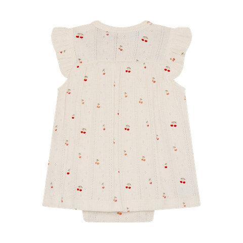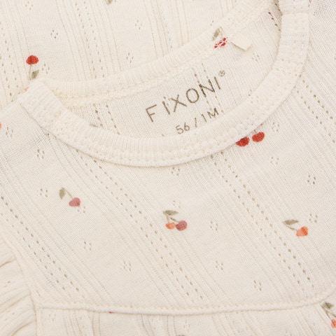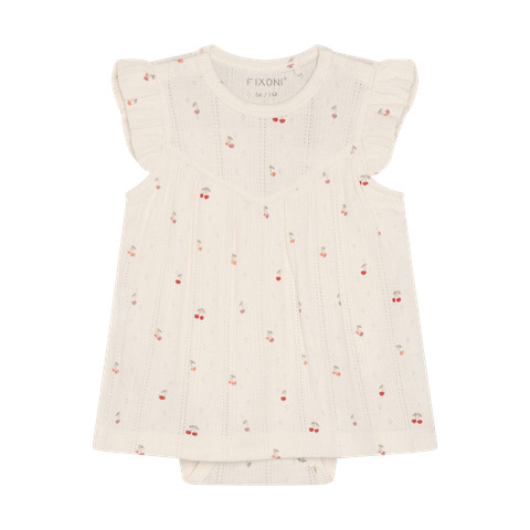 kundeservice@pixizoo.dkKortærmet Bodykjole Pointelle fra Fixoni er en yndig og komfortabel løsning til de mindste. Kjolen kombinerer det praktiske fra en body med det fine udtryk fra en kjole, så din baby både ser sød ud og har maksimal bevægelsesfrihed. Den bløde pointelle-strik med små kirsebærmotiver giver et let og luftigt look, mens flæserne på skuldrene tilføjer et ekstra feminint touch. Trykknapperne i bunden gør det nemt at skifte ble, og den bløde kvalitet sikrer, at kjolen føles behagelig mod huden hele dagen. Perfekt til både hverdag og festlige lejligheder, hvor komfort og stil går hånd i hånd.