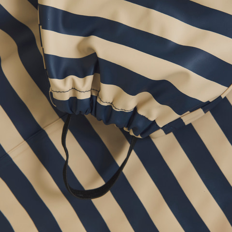 Hætten er aftagelig og fastgøres med trykknapper på halskraven. Regndragten lukkes foran med en vandtæt lynlås. For at sikre en god pasform har hættens åbning, ærmerne og taljen elastiske kanter. Buksebenene er desuden forsynet med praktiske, justerbare elastikstropper, der kan trækkes under fodtøjet, så dragten holdes godt på plads.
